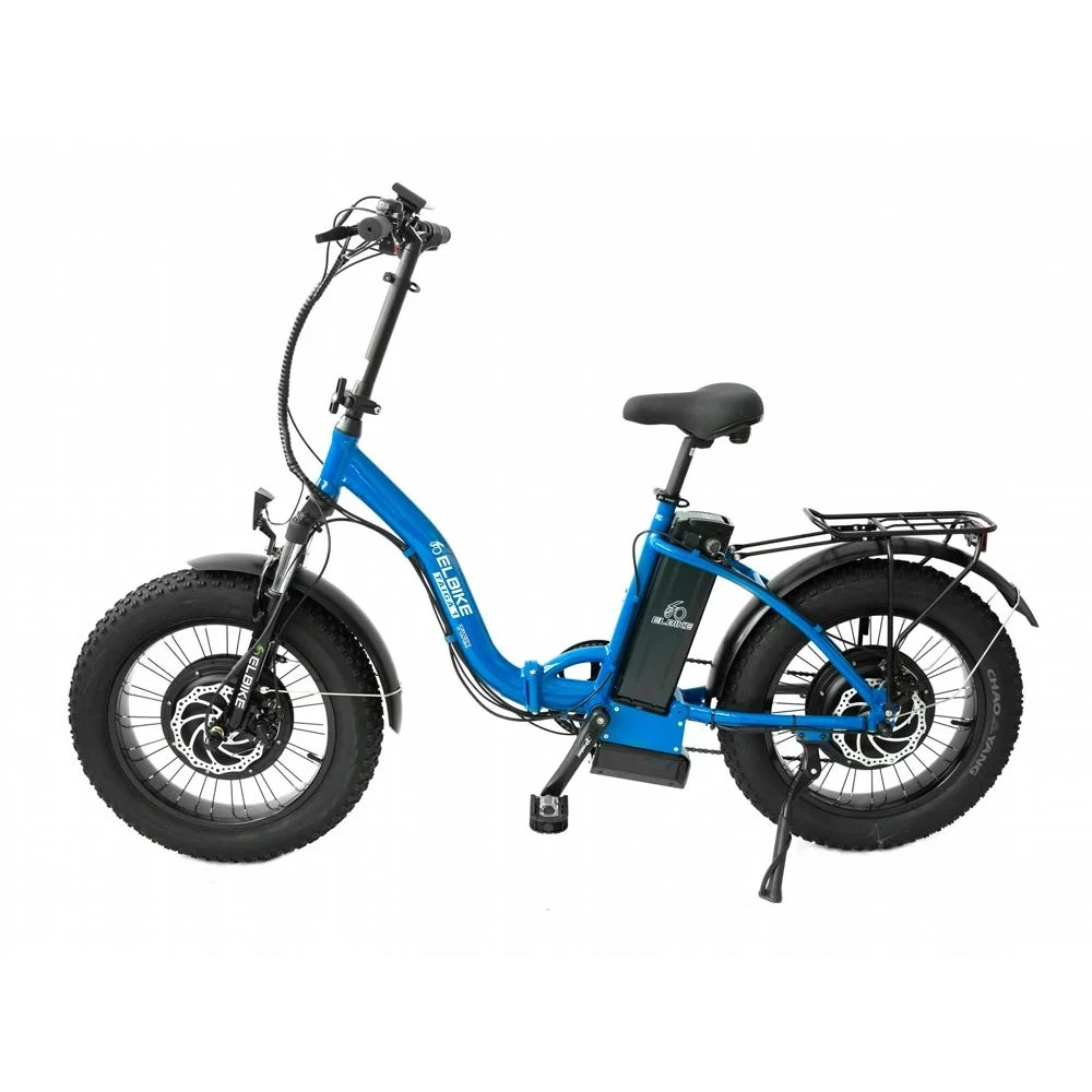Электрофэтбайк Elbike TAIGA 1 Twix в синем цвете выглядит привлекательно и заметно на фоне другой техники. Заниженная конструкция рамы допускает эксплуатацию тс представительницами слабого пола. Купить электрофэтбайк для езды по городской местности и бездорожью предлагает наш интернет-магазин.