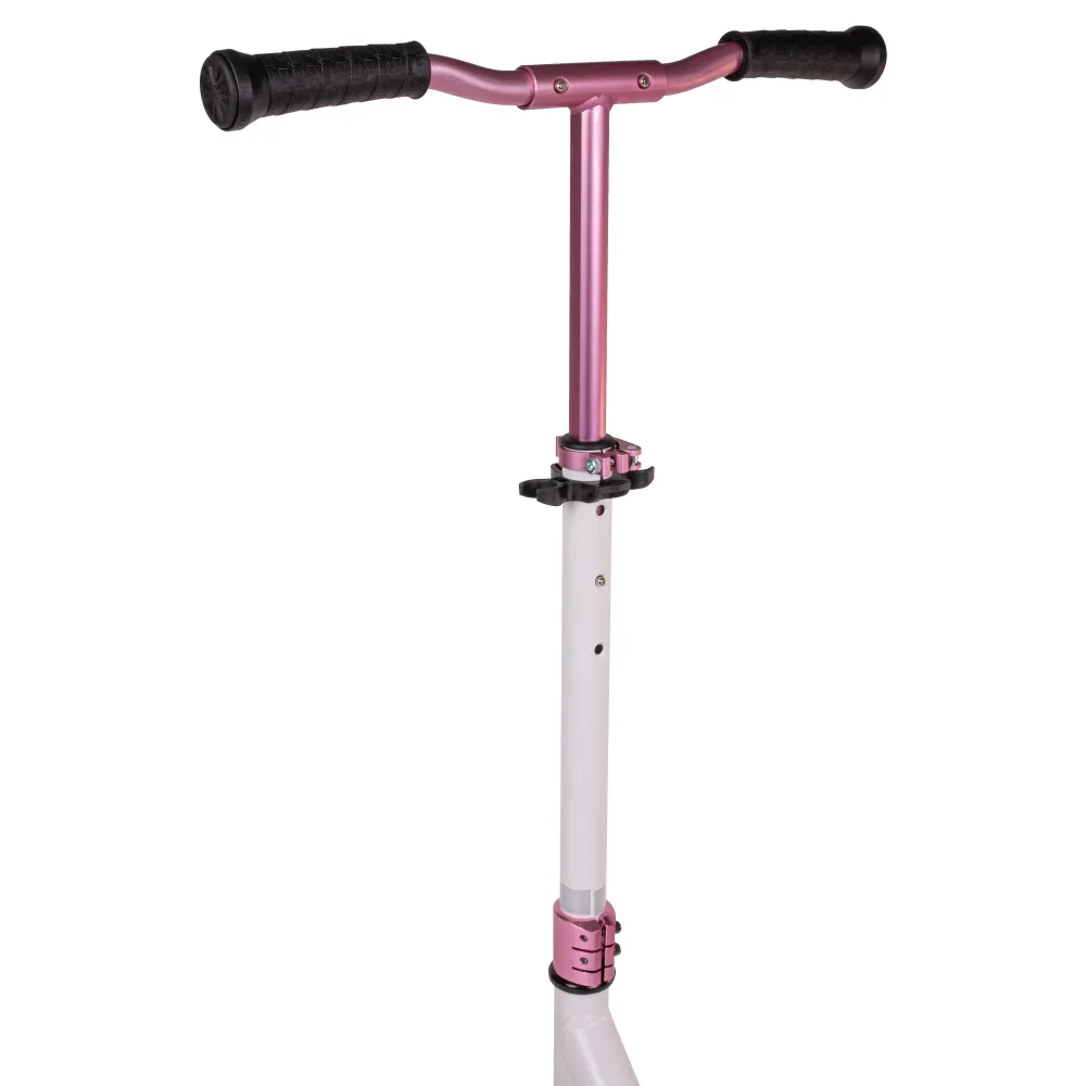 Техника оснащена удобным рулем изогнутой формы. Грипсы представлены в виде намотки, не скользят, не провоцируют случайного соскальзывания рук. В сложенном варианте для ручек производителем предусмотрены спецзажимы. Рулевая часть регулируется в трех положениях (88-93-98 см), в зависимости от индивидуальных параметров роста ездока. Больше всего детей привлекает светоотражающая часть полосы, размещенная на рулевой части. Она делает самокат заметным на фоне других участников движения, увеличивает степень безопасности ездока.